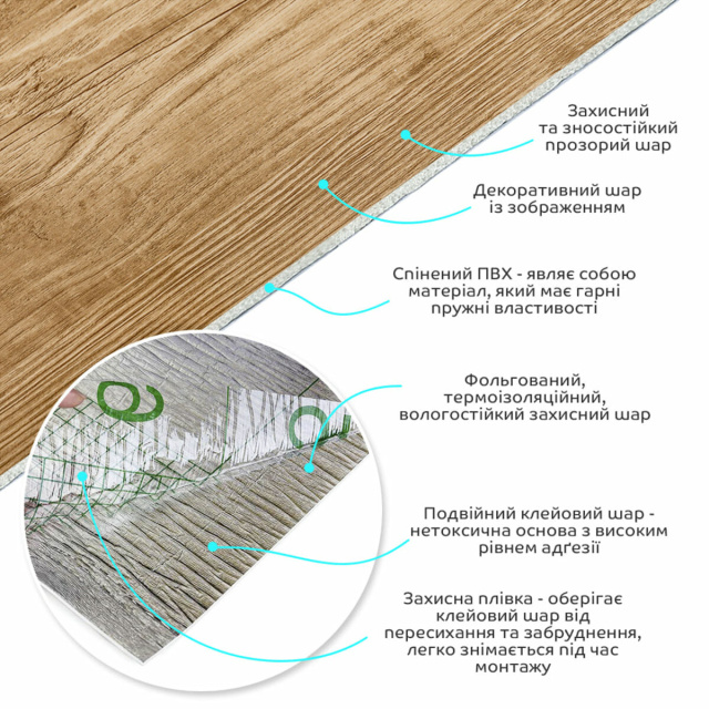 Вінілова плитка в рулоніВінілова плитка, що самоклеїться в рулоні - декоративний матеріал для внутрішнього оздоблення, що легко монтується завдяки клейовій основі. Має різні дизайни, що імітують натуральні матеріали, підходять під різні інтер'єрні рішення. Матеріал: полівінілхлорид (PVC) Розміри: 600 х 3000 х 2 мм Увага! Допустиме відхилення ±3% Площа покриття: 600 х 3000 мм – 1,8 м² Фактура: рівна, з імітацією натуральних матеріалів. Поверхня глянсова або матова. Плитка складається з таких шарів: Полімерний шар, що захищає від потертостей та дрібних механічних пошкоджень, забезпечує довговічність використання, а УФ захист допомагає запобігти вигоранню, зберігаючи колір насиченим, за рахунок чого плитка довго має свій первісний естетичний вигляд. Декоративний шар: плівка з кольоровим друком високої роздільної здатності, яка повністю імітує фактуру природних матеріалів завдяки чіткому та детальному зображенню. Основний шар із спіненого полівінілхлориду (ПВХ) – це полімер, що складається з довгих ланцюгів молекул вінілхлориду, в яких містяться атоми хлору, це надає матеріалу стійкість до дії хімічних речовин. ПВХ є аморфним полімером, така особливість будови робить його пружним та ударостійким, а завдяки стабілізаторам та пом'якшувачам, матеріал має малу вагу. Фольгований шар: основна властивість цього шару – відображення теплових хвиль, що дозволяє мінімізувати теплові втрати, тим самим покращити теплоізоляцію приміщення. Клейовий шар: нетоксична основа з високим рівнем адгезії. Захисна плівка – оберігає клейовий шар від пересихання та забруднення, легко знімається під час монтажу. Температурний режим: під впливом високих температур може змінювати форму. У кухонній зоні поруч із джерелами вогню встановлення плитки необхідно проводити на відстані 30-50 см. Застосування: внутрішні оздоблювальні роботи: декорування стін у всіх видах житлових приміщень (кухня, ванна кімната, вітальня, дитяча або спальня, вхідна група) та комерційних приміщень (офісні приміщення, зони рецепцій, магазини, салони краси або фітнес-центри, місця суспільної присутності, майстерні), меблів, дверей та інших рівних поверхонь. Властивості та переваги матеріалу: Легка установка: шар, що самоклеїться, робить процес укладання швидким і простим, не вимагаючи додатково клею, інших матеріалів або фахівців. Матеріал укладається стик у стик, його можна різати ножицями чи монтажним ножем, між смугами не розходиться, не набухає та не деформується. Відсоток обрізу становить 1%, що є найкращим показником для настінних покриттів; Стійкість до вологи: вінілова плитка в рулоні вологостійка, що робить її відмінним вибором для ванних кімнат, кухні та інших приміщень з підвищеною вологістю, матеріал стійкий також до впливу пари та появи цвілі. Плитка підходить для створення фартуха кухні, можна клеїти біля плити на відстані не менше ніж 30-50 см; Довговічність: міцність та зносостійкість вінілу дозволяє плитці залишатися в первинному стані протягом тривалого періоду часу; Естетична складова: широкий вибір дизайнів, що імітують натуральні матеріали, кольорів дозволяє підібрати покриття, яке відповідає вашому стилю та інтер'єру, дуже добре комбінується за колірною гамою, дозволяючи створити власний дизайн приміщення; Легкий догляд: вініл легко очищається і не вимагає спеціальн
