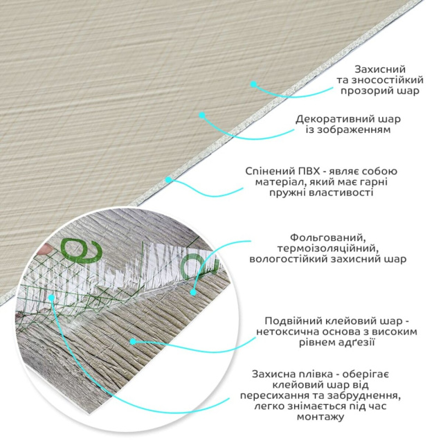Вінілова плитка в рулоніВінілова плитка, що самоклеїться в рулоні - декоративний матеріал для внутрішнього оздоблення, що легко монтується завдяки клейовій основі. Має різні дизайни, що імітують натуральні матеріали, підходять під різні інтер'єрні рішення. Матеріал: полівінілхлорид (PVC) Розміри: 600 х 3000 х 2 мм Увага! Допустиме відхилення ±3% Площа покриття: 600 х 3000 мм – 1,8 м² Фактура: рівна, з імітацією натуральних матеріалів. Поверхня глянсова або матова. Плитка складається з таких шарів: Полімерний шар, що захищає від потертостей та дрібних механічних пошкоджень, забезпечує довговічність використання, а УФ захист допомагає запобігти вигоранню, зберігаючи колір насиченим, за рахунок чого плитка довго має свій первісний естетичний вигляд. Декоративний шар: плівка з кольоровим друком високої роздільної здатності, яка повністю імітує фактуру природних матеріалів завдяки чіткому та детальному зображенню. Основний шар із спіненого полівінілхлориду (ПВХ) – це полімер, що складається з довгих ланцюгів молекул вінілхлориду, в яких містяться атоми хлору, це надає матеріалу стійкість до дії хімічних речовин. ПВХ є аморфним полімером, така особливість будови робить його пружним та ударостійким, а завдяки стабілізаторам та пом'якшувачам, матеріал має малу вагу. Фольгований шар: основна властивість цього шару – відображення теплових хвиль, що дозволяє мінімізувати теплові втрати, тим самим покращити теплоізоляцію приміщення. Клейовий шар: нетоксична основа з високим рівнем адгезії. Захисна плівка – оберігає клейовий шар від пересихання та забруднення, легко знімається під час монтажу. Температурний режим: під впливом високих температур може змінювати форму. У кухонній зоні поруч із джерелами вогню встановлення плитки необхідно проводити на відстані 30-50 см. Застосування: внутрішні оздоблювальні роботи: декорування стін у всіх видах житлових приміщень (кухня, ванна кімната, вітальня, дитяча або спальня, вхідна група) та комерційних приміщень (офісні приміщення, зони рецепцій, магазини, салони краси або фітнес-центри, місця суспільної присутності, майстерні), меблів, дверей та інших рівних поверхонь. Властивості та переваги матеріалу: Легка установка: шар, що самоклеїться, робить процес укладання швидким і простим, не вимагаючи додатково клею, інших матеріалів або фахівців. Матеріал укладається стик у стик, його можна різати ножицями чи монтажним ножем, між смугами не розходиться, не набухає та не деформується. Відсоток обрізу становить 1%, що є найкращим показником для настінних покриттів; Стійкість до вологи: вінілова плитка в рулоні вологостійка, що робить її відмінним вибором для ванних кімнат, кухні та інших приміщень з підвищеною вологістю, матеріал стійкий також до впливу пари та появи цвілі. Плитка підходить для створення фартуха кухні, можна клеїти біля плити на відстані не менше ніж 30-50 см; Довговічність: міцність та зносостійкість вінілу дозволяє плитці залишатися в первинному стані протягом тривалого періоду часу; Естетична складова: широкий вибір дизайнів, що імітують натуральні матеріали, кольорів дозволяє підібрати покриття, яке відповідає вашому стилю та інтер'єру, дуже добре комбінується за колірною гамою, дозволяючи створити власний дизайн приміщення; Легкий догляд: вініл легко очищається і не вимагає спеціальн