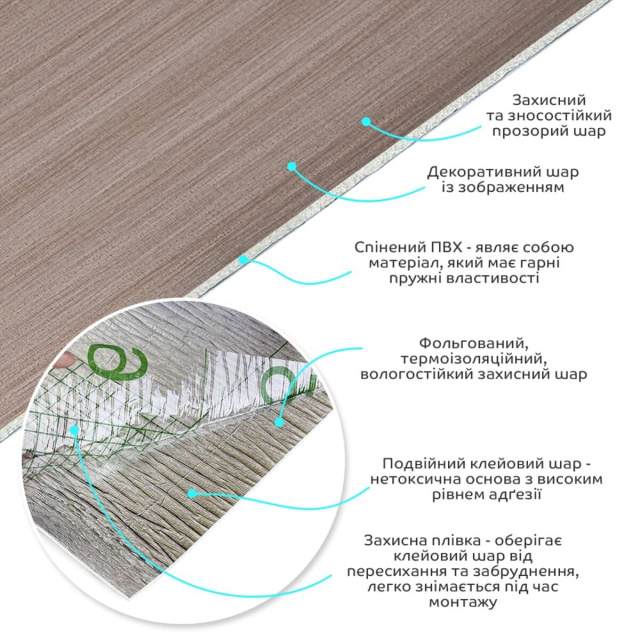 Вінілова плитка в рулоніВінілова плитка, що самоклеїться в рулоні - декоративний матеріал для внутрішнього оздоблення, що легко монтується завдяки клейовій основі. Має різні дизайни, що імітують натуральні матеріали, підходять під різні інтер'єрні рішення. Матеріал: полівінілхлорид (PVC) Розміри: 600 х 3000 х 2 мм Увага! Допустиме відхилення ±3% Площа покриття: 600 х 3000 мм – 1,8 м² Фактура: рівна, з імітацією натуральних матеріалів. Поверхня глянсова або матова. Плитка складається з таких шарів: Полімерний шар, що захищає від потертостей та дрібних механічних пошкоджень, забезпечує довговічність використання, а УФ захист допомагає запобігти вигоранню, зберігаючи колір насиченим, за рахунок чого плитка довго має свій первісний естетичний вигляд. Декоративний шар: плівка з кольоровим друком високої роздільної здатності, яка повністю імітує фактуру природних матеріалів завдяки чіткому та детальному зображенню. Основний шар із спіненого полівінілхлориду (ПВХ) – це полімер, що складається з довгих ланцюгів молекул вінілхлориду, в яких містяться атоми хлору, це надає матеріалу стійкість до дії хімічних речовин. ПВХ є аморфним полімером, така особливість будови робить його пружним та ударостійким, а завдяки стабілізаторам та пом'якшувачам, матеріал має малу вагу. Фольгований шар: основна властивість цього шару – відображення теплових хвиль, що дозволяє мінімізувати теплові втрати, тим самим покращити теплоізоляцію приміщення. Клейовий шар: нетоксична основа з високим рівнем адгезії. Захисна плівка – оберігає клейовий шар від пересихання та забруднення, легко знімається під час монтажу. Температурний режим: під впливом високих температур може змінювати форму. У кухонній зоні поруч із джерелами вогню встановлення плитки необхідно проводити на відстані 30-50 см. Застосування: внутрішні оздоблювальні роботи: декорування стін у всіх видах житлових приміщень (кухня, ванна кімната, вітальня, дитяча або спальня, вхідна група) та комерційних приміщень (офісні приміщення, зони рецепцій, магазини, салони краси або фітнес-центри, місця суспільної присутності, майстерні), меблів, дверей та інших рівних поверхонь. Властивості та переваги матеріалу: Легка установка: шар, що самоклеїться, робить процес укладання швидким і простим, не вимагаючи додатково клею, інших матеріалів або фахівців. Матеріал укладається стик у стик, його можна різати ножицями чи монтажним ножем, між смугами не розходиться, не набухає та не деформується. Відсоток обрізу становить 1%, що є найкращим показником для настінних покриттів; Стійкість до вологи: вінілова плитка в рулоні вологостійка, що робить її відмінним вибором для ванних кімнат, кухні та інших приміщень з підвищеною вологістю, матеріал стійкий також до впливу пари та появи цвілі. Плитка підходить для створення фартуха кухні, можна клеїти біля плити на відстані не менше ніж 30-50 см; Довговічність: міцність та зносостійкість вінілу дозволяє плитці залишатися в первинному стані протягом тривалого періоду часу; Естетична складова: широкий вибір дизайнів, що імітують натуральні матеріали, кольорів дозволяє підібрати покриття, яке відповідає вашому стилю та інтер'єру, дуже добре комбінується за колірною гамою, дозволяючи створити власний дизайн приміщення; Легкий догляд: вініл легко очищається і не вимагає спеціальн
