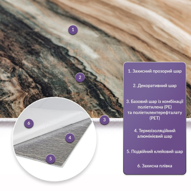 Матеріал: PE+PET, складається з суміші двох полімерів: поліетилену (PE) та поліетилентерефталату (PET) Розміри: Плитка: 60 см х 30 см х 2 мм Вага: 60 см х 30 см - 62г Площа покриття 60 см х 30 см х 2 мм – 0,18 м2, кількість на 1 м2 – 6 одиниць Фактура: рівна Як і в натуральних матеріалах, малюнки РЕТ плиток можуть трохи відрізнятися між собою, зберігаючи при цьому загальний дизайн та колір, що ще більше підкреслює природну імітацію. Також просимо взяти до уваги, що виробник має право змінювати зовнішній вигляд товару, зокрема відтінок та малюнок, на власний розсуд і без попереднього повідомлення. Шари матеріалу: Захисний прозорий шар Декоративний шар із зображенням Базовий шар з комбинації поліетилена (PE) і поліетилентерефталату (PET) Термоізоляционийй алюмінієвий шар Подвійний клейовий шар Захисний папір Температурний режим: -40 – +75 С Застосування: внутрішні оздоблювальні роботи: декорування стін у всіх видах житлових приміщень (кухня, ванна кімната, вітальня, дитяча або спальня, вхідна група) та комерційних приміщень (офісні приміщення, зони рецепцій, магазини, салони краси або фітнес-центри, місця громадської присутності), меблів, дверей та інших рівних поверхонь. Властивості та переваги матеріалу: 1. Легкість та міцність: плитка легка та міцна, що спрощує її логістику, установку та забезпечує довгий термін служби. Матеріал легкий в установці, можна різати ножицями чи монтажним ножем, не потребує додаткових матеріалів чи спеціалістів. Між смугами не розходиться, не роздмухується і не деформується. Відсоток обрізу становить 1%, що є найкращим показником для настінних покриттів; 2. Стійкість до вологи: матеріал стійкий до впливу вологи та пари, а також до появи плісняви, що робить його придатним для використання у приміщеннях з високою вологістю, таких як ванни та кухні. Плитка підходить для створення фартуха кухні, можна клеїти біля плити на відстані не менше ніж 20-25 см; 3. Ізоляція: плитка має звукову та теплоізоляцію завдяки наявності повітряних прошарків та додатковому алюмінієвому шару; 4. Антистатичний ефект: у складі покриття є антистатик, тому пил не збирається на поверхні; 5. Різноманітність дизайну: плитки доступні у різноманітних кольорових та структурних варіаціях, дозволяючи вибрати відповідний дизайн для вашого інтер'єру; 6. Імітація інших матеріалів: дизайн плитки спроектований так, щоб імітувати інші матеріали, такі як камінь або кераміку, представляючи естетично приємне рішення за доступною ціною; 7. Екологічність: матеріал може бути утилізований та перероблений, що робить його більш екологічно чистим варіантом у порівнянні з деякими іншими матеріалами; 8. Простота в обслуговуванні: поверхня плитки легко очищується та не потребує особливого догляду. 9. Тривалість експлуатації: матеріал є міцним та стійким до зносу, що гарантує тривалий термін служби плитки. Інструкція з монтажу: Крок 1 Необхідно переконатися, що поверхня, на яку ви збираєтесь встановити плитку, чиста, суха та рівна. Необхідно видалити будь-який пил, бруд або олію з поверхні, при необхідності вирівняти поверхню. Плитка та поверхня повинні бути кімнатної температури, щоб забезпечити гарне зчеплення клейової основи. Крок 2 Зняти захисну плівку зі зворотного боку плитки, щоб відкрити клейку поверхню. Крок 3 Необхідно розпочати установку з одного кута і акуратно притиснути пли