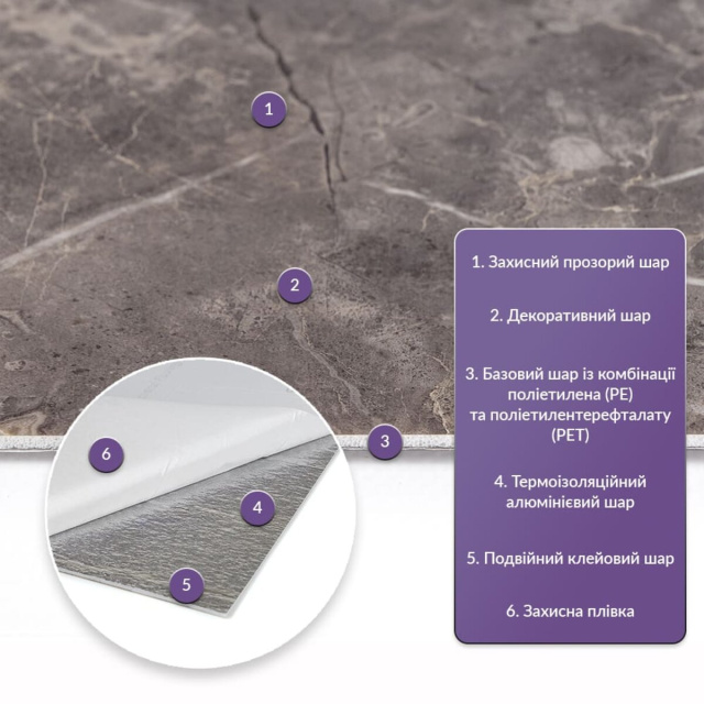Матеріал: PE+PET, складається з суміші двох полімерів: поліетилену (PE) та поліетилентерефталату (PET) Розміри: Плитка: 60 см х 30 см х 2 мм Вага: 60 см х 30 см - 62г Площа покриття 60 см х 30 см х 2 мм – 0,18 м2, кількість на 1 м2 – 6 одиниць Фактура: рівна Як і в натуральних матеріалах, малюнки РЕТ плиток можуть трохи відрізнятися між собою, зберігаючи при цьому загальний дизайн та колір, що ще більше підкреслює природну імітацію. Також просимо взяти до уваги, що виробник має право змінювати зовнішній вигляд товару, зокрема відтінок та малюнок, на власний розсуд і без попереднього повідомлення. Шари матеріалу: Захисний прозорий шар Декоративний шар із зображенням Базовий шар з комбинації поліетилена (PE) і поліетилентерефталату (PET) Термоізоляционийй алюмінієвий шар Подвійний клейовий шар Захисний папір Температурний режим: -40 – +75 С Застосування: внутрішні оздоблювальні роботи: декорування стін у всіх видах житлових приміщень (кухня, ванна кімната, вітальня, дитяча або спальня, вхідна група) та комерційних приміщень (офісні приміщення, зони рецепцій, магазини, салони краси або фітнес-центри, місця громадської присутності), меблів, дверей та інших рівних поверхонь. Властивості та переваги матеріалу: 1. Легкість та міцність: плитка легка та міцна, що спрощує її логістику, установку та забезпечує довгий термін служби. Матеріал легкий в установці, можна різати ножицями чи монтажним ножем, не потребує додаткових матеріалів чи спеціалістів. Між смугами не розходиться, не роздмухується і не деформується. Відсоток обрізу становить 1%, що є найкращим показником для настінних покриттів; 2. Стійкість до вологи: матеріал стійкий до впливу вологи та пари, а також до появи плісняви, що робить його придатним для використання у приміщеннях з високою вологістю, таких як ванни та кухні. Плитка підходить для створення фартуха кухні, можна клеїти біля плити на відстані не менше ніж 20-25 см; 3. Ізоляція: плитка має звукову та теплоізоляцію завдяки наявності повітряних прошарків та додатковому алюмінієвому шару; 4. Антистатичний ефект: у складі покриття є антистатик, тому пил не збирається на поверхні; 5. Різноманітність дизайну: плитки доступні у різноманітних кольорових та структурних варіаціях, дозволяючи вибрати відповідний дизайн для вашого інтер'єру; 6. Імітація інших матеріалів: дизайн плитки спроектований так, щоб імітувати інші матеріали, такі як камінь або кераміку, представляючи естетично приємне рішення за доступною ціною; 7. Екологічність: матеріал може бути утилізований та перероблений, що робить його більш екологічно чистим варіантом у порівнянні з деякими іншими матеріалами; 8. Простота в обслуговуванні: поверхня плитки легко очищується та не потребує особливого догляду. 9. Тривалість експлуатації: матеріал є міцним та стійким до зносу, що гарантує тривалий термін служби плитки. Інструкція з монтажу: Крок 1 Необхідно переконатися, що поверхня, на яку ви збираєтесь встановити плитку, чиста, суха та рівна. Необхідно видалити будь-який пил, бруд або олію з поверхні, при необхідності вирівняти поверхню. Плитка та поверхня повинні бути кімнатної температури, щоб забезпечити гарне зчеплення клейової основи. Крок 2 Зняти захисну плівку зі зворотного боку плитки, щоб відкрити клейку поверхню. Крок 3 Необхідно розпочати установку з одного кута і акуратно притиснути пли