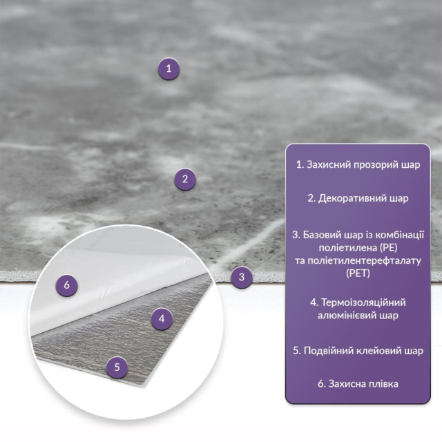 Матеріал: PE+PET, складається з суміші двох полімерів: поліетилену (PE) та поліетилентерефталату (PET) Розміри: Плитка: 60 см х 30 см х 2 мм Вага: 60 см х 30 см - 62г Площа покриття 60 см х 30 см х 2 мм – 0,18 м2, кількість на 1 м2 – 6 одиниць Фактура: рівна Як і в натуральних матеріалах, малюнки РЕТ плиток можуть трохи відрізнятися між собою, зберігаючи при цьому загальний дизайн та колір, що ще більше підкреслює природну імітацію. Також просимо взяти до уваги, що виробник має право змінювати зовнішній вигляд товару, зокрема відтінок та малюнок, на власний розсуд і без попереднього повідомлення. Шари матеріалу: Захисний прозорий шар Декоративний шар із зображенням Базовий шар з комбинації поліетилена (PE) і поліетилентерефталату (PET) Термоізоляционийй алюмінієвий шар Подвійний клейовий шар Захисний папір Температурний режим: -40 – +75 С Застосування: внутрішні оздоблювальні роботи: декорування стін у всіх видах житлових приміщень (кухня, ванна кімната, вітальня, дитяча або спальня, вхідна група) та комерційних приміщень (офісні приміщення, зони рецепцій, магазини, салони краси або фітнес-центри, місця громадської присутності), меблів, дверей та інших рівних поверхонь. Властивості та переваги матеріалу: 1. Легкість та міцність: плитка легка та міцна, що спрощує її логістику, установку та забезпечує довгий термін служби. Матеріал легкий в установці, можна різати ножицями чи монтажним ножем, не потребує додаткових матеріалів чи спеціалістів. Між смугами не розходиться, не роздмухується і не деформується. Відсоток обрізу становить 1%, що є найкращим показником для настінних покриттів; 2. Стійкість до вологи: матеріал стійкий до впливу вологи та пари, а також до появи плісняви, що робить його придатним для використання у приміщеннях з високою вологістю, таких як ванни та кухні. Плитка підходить для створення фартуха кухні, можна клеїти біля плити на відстані не менше ніж 20-25 см; 3. Ізоляція: плитка має звукову та теплоізоляцію завдяки наявності повітряних прошарків та додатковому алюмінієвому шару; 4. Антистатичний ефект: у складі покриття є антистатик, тому пил не збирається на поверхні; 5. Різноманітність дизайну: плитки доступні у різноманітних кольорових та структурних варіаціях, дозволяючи вибрати відповідний дизайн для вашого інтер'єру; 6. Імітація інших матеріалів: дизайн плитки спроектований так, щоб імітувати інші матеріали, такі як камінь або кераміку, представляючи естетично приємне рішення за доступною ціною; 7. Екологічність: матеріал може бути утилізований та перероблений, що робить його більш екологічно чистим варіантом у порівнянні з деякими іншими матеріалами; 8. Простота в обслуговуванні: поверхня плитки легко очищується та не потребує особливого догляду. 9. Тривалість експлуатації: матеріал є міцним та стійким до зносу, що гарантує тривалий термін служби плитки. Інструкція з монтажу: Крок 1 Необхідно переконатися, що поверхня, на яку ви збираєтесь встановити плитку, чиста, суха та рівна. Необхідно видалити будь-який пил, бруд або олію з поверхні, при необхідності вирівняти поверхню. Плитка та поверхня повинні бути кімнатної температури, щоб забезпечити гарне зчеплення клейової основи. Крок 2 Зняти захисну плівку зі зворотного боку плитки, щоб відкрити клейку поверхню. Крок 3 Необхідно розпочати установку з одного кута і акуратно притиснути пли