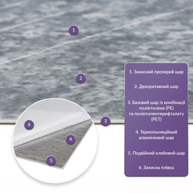 Матеріал: PE+PET, складається з суміші двох полімерів: поліетилену (PE) та поліетилентерефталату (PET) Розміри: Рулон: 60 см х 300 см х 2 мм Вага: 60 см х 300 см - 900г Площа покриття 60 см х 300 см х 2 мм – 1,8 м2, кількість на 1 м2 – 1 одиниць Фактура: рівна Шари матеріалу: Захисний прозорий шар Декоративний шар із зображенням Базовий шар з комбинації поліетилена (PE) і поліетилентерефталату (PET) Термоізоляционийй алюмінієвий шар Подвійний клейовий шар Захисний папір Температурний режим: -40 – +75 С Застосування: внутрішні оздоблювальні роботи: декорування стін у всіх видах житлових приміщень (кухня, ванна кімната, вітальня, дитяча або спальня, вхідна група) та комерційних приміщень (офісні приміщення, зони рецепцій, магазини, салони краси або фітнес-центри, місця громадської присутності), меблів, дверей та інших рівних поверхонь. Властивості та переваги матеріалу: 1. Легкість та міцність: плитка легка та міцна, що спрощує її логістику, установку та забезпечує довгий термін служби. Матеріал легкий в установці, можна різати ножицями чи монтажним ножем, не потребує додаткових матеріалів чи спеціалістів. Між смугами не розходиться, не роздмухується і не деформується. Відсоток обрізу становить 1%, що є найкращим показником для настінних покриттів; 2. Стійкість до вологи: матеріал стійкий до впливу вологи та пари, а також до появи плісняви, що робить його придатним для використання у приміщеннях з високою вологістю, таких як ванни та кухні. Плитка підходить для створення фартуха кухні, можна клеїти біля плити на відстані не менше ніж 20-25 см; 3. Ізоляція: плитка має звукову та теплоізоляцію завдяки наявності повітряних прошарків та додатковому алюмінієвому шару; 4. Антистатичний ефект: у складі покриття є антистатик, тому пил не збирається на поверхні; 5. Різноманітність дизайну: плитки доступні у різноманітних кольорових та структурних варіаціях, дозволяючи вибрати відповідний дизайн для вашого інтер'єру; 6. Імітація інших матеріалів: дизайн плитки спроектований так, щоб імітувати інші матеріали, такі як камінь або кераміку, представляючи естетично приємне рішення за доступною ціною; 7. Екологічність: матеріал може бути утилізований та перероблений, що робить його більш екологічно чистим варіантом у порівнянні з деякими іншими матеріалами; 8. Простота в обслуговуванні: поверхня плитки легко очищується та не потребує особливого догляду. 9. Тривалість експлуатації: матеріал є міцним та стійким до зносу, що гарантує тривалий термін служби плитки. Інструкція з монтажу: Крок 1 Необхідно переконатися, що поверхня, на яку ви збираєтесь встановити плитку, чиста, суха та рівна. Необхідно видалити будь-який пил, бруд або олію з поверхні, при необхідності вирівняти поверхню. Плитка та поверхня повинні бути кімнатної температури, щоб забезпечити гарне зчеплення клейової основи. Крок 2 Зняти захисну плівку зі зворотного боку плитки, щоб відкрити клейку поверхню. Крок 3 Необхідно розпочати установку з одного кута і акуратно притиснути плитку до поверхні, стежачи за тим, щоб плитка встановлювалася рівно і акуратно, уникаючи утворення бульбашок або зморшок. Крок 4 Плитку можна різати, використовуючи при цьому ніж або ножиці, щоб підганяти плитки за розміром, особливо по краях та в кутах поверхні. Крок 5 Плитки необхідно щільно притискати до поверхні, щоб забезпечити гарне зчепленн