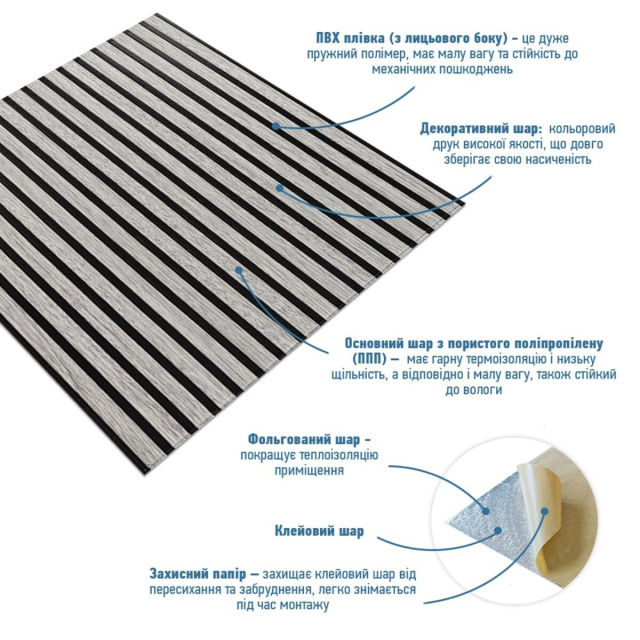 Легкість монтажу: наявність клейового шару дозволяє встановити панелі без необхідності застосування додаткових матеріалів.