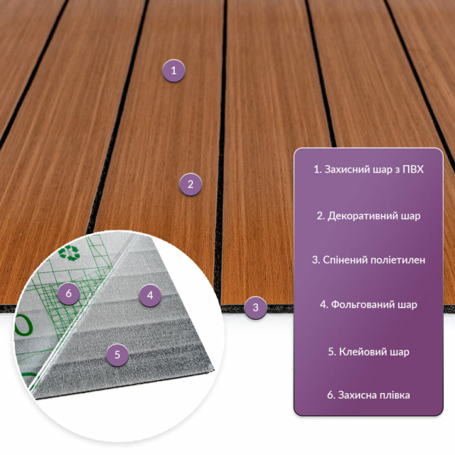 Вінілова гнучка рейка - декоративний матеріал для внутрішнього оздоблення стін, що легко монтується завдяки клейовій основі. Має різні дизайни, що імітують натуральні матеріали, підходять під різні інтер'єрні рішення. Розміри: 600х600х2,8 мм; 600х3000х2,8 мм Площа покриття: 600х600 – 0,36 м², 600х3000 мм – 1,8 м² Фактура: рельєфна, імітація дерев'яної рейки. Поверхня матова. Плитка складається з наступних шарів: Захисний шар з ПВХ, захищає від потертостей та дрібних механічних пошкоджень, забезпечує довговічність використання, а УФ захист допомагає запобігти вигоранню, зберігаючи колір насиченим, за рахунок чого вінілова рейка довго має свій первісний естетичний вигляд.Також шар з ПВХ має стійкість до дії хімічних речовин, а за рахунок аморфності кристалічних ґрат ПВХ, дуже пружна, має малу вагу. Декоративний шар: плівка з кольоровим друком високої роздільної якості, яка повністю імітує фактуру природних матеріалів завдяки чіткому та деталізованому зображенню. Вспінений поліетилен (РЕ) - це полімерний матеріал із закритопористою структурою, легкий і гнучкий, має відмінні теплоізоляційні, звукоізоляційні та амортизаційні властивості, стійкий до вологи. Фольгований шар: основна властивість цього шару – відображення теплових хвиль, що дозволяє мінімізувати теплові втрати, тим самим покращити теплоізоляцію приміщення. Клейовий шар: нетоксична основа з високим рівнем адгезії. Захисна плівка – оберігає клейовий шар від пересихання та забруднення, легко знімається під час монтажу. Температурний режим: під впливом високих температур можуть деформуватися. У кухонній зоні поруч із джерелами вогню встановлення вінілової рейки необхідно проводити на відстані 30-50 см. Застосування: внутрішні оздоблювальні роботи в житлових і комерційних приміщеннях. Вінілові рейки ідеально підходять для стін у кухнях, ванних кімнатах, вітальнях, дитячих, спальнях, вхідних зонах. Використовується в офісах, рецепціях, магазинах, салонах краси, фітнес-центрах, готелях, ресторанах, кафе, майстернях та місцях громадської присутності. Підходять для оздоблення меблів, дверей, торгового обладнання, підвіконь та інших рівних поверхонь. Властивості та переваги вінілових рейок: Легка установка: Завдяки клейовому шару монтаж вінілових рейок швидкий і простий, без потреби в додаткових матеріалах. Рейки легко ріжуться монтажним ножем або ножицями, укладаються стик у стик. Відсоток обрізу для настінних покриттів дуже низький. Стійкість до вологи: Вінілові рейки вологостійкі, що робить їх ідеальними для використання у вологих приміщеннях, таких як ванні кімнати та кухні. Вони не набухають і стійкі до пари та появи цвілі. Довговічність: Вінілові рейки зносостійкі, стійкі до механічних пошкоджень та подряпин, що забезпечує їх тривале використання в інтенсивно експлуатованих приміщеннях. Естетичні можливості: Широкий вибір текстур, кольорів і візерунків, що імітують натуральні матеріали. Це дозволяє підібрати рейки для будь-якого інтер'єру і створювати унікальні декоративні рішення. Також рейки можна монтувати в різних напрямках (горизонтально, вертикально або під кутом), що дає змогу реалізувати різні дизайнерські ідеї і створювати оригінальні візуальні ефекти. Легкий догляд: Вінілові рейки легко миються, не вимагають спеціальних засобів для очищення і не вбирають бруд. 