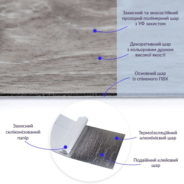 Захисний силіконізований папір – оберігає клейовий шар від пересихання та забруднення, легко знімається під час монтажу.